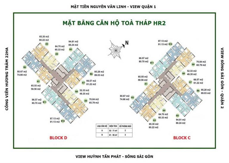 2. Tòa HR1 và HR2 : Hai tòa tháp HR1 và HR2 cao 36 tầng nổi và 2 tầng hâm . Mỗi tòa có 2 block được thiết kế theo hình quạt 3 cánh nhằm tối ưu diện tích và mặt thoáng của khu căn hộ . Mỗi tầng tại 2 tòa tháp này được bố trí 11 căn hộ loại 2PN và 3PN đan xen với nhau . Tòa HR1 và HR2 được triển khai bán hàng vào Quý 3/2018 và năm 2019 . Khách hàng mua căn hộ tại 2 tháp này đã nhận bàn giao vào năm 2020 và đi vào sử dụng.