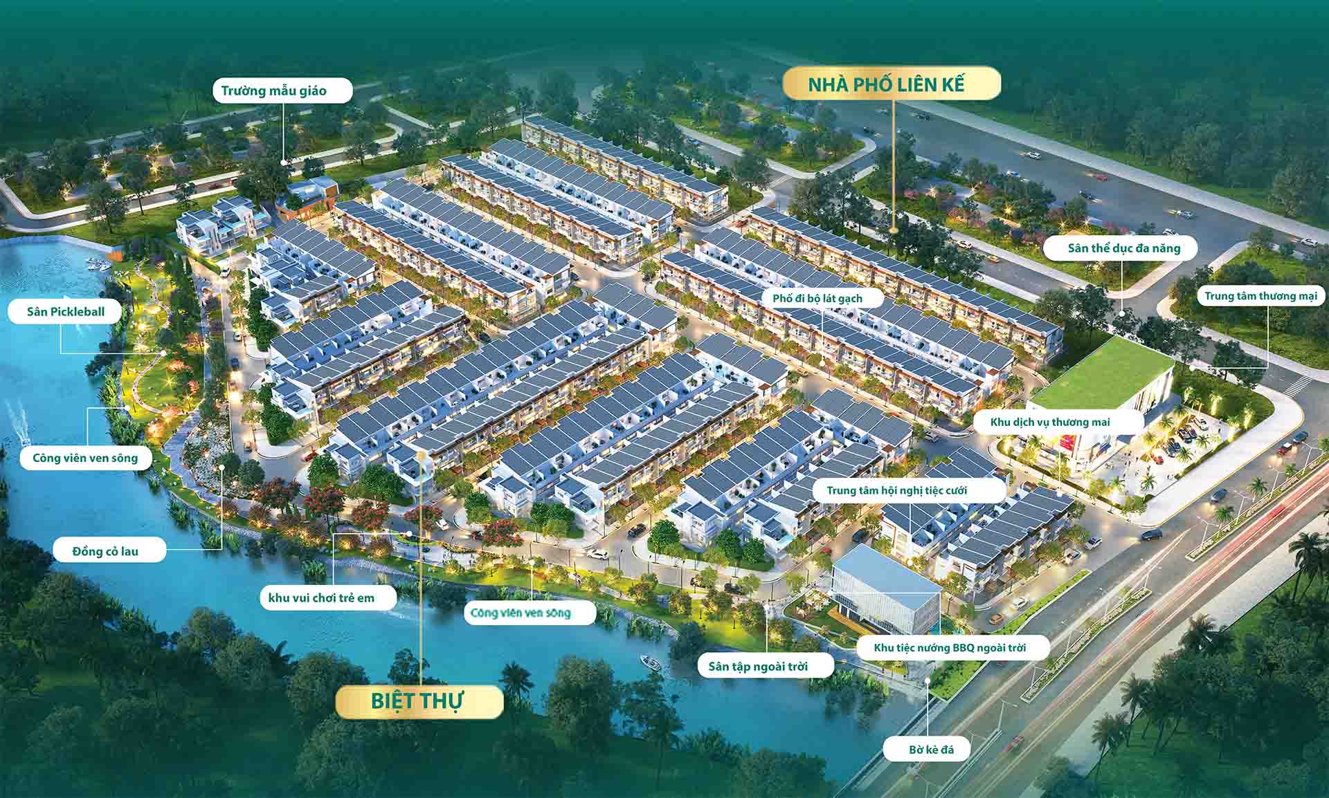 Là khu compound tách biệt với khu vực bên ngoài . Dự án sở hữu cho mình công viên nội khu , công viên ven sông , sân thể thao ngoài trời , trường mẫu giáo và trung tâm thương mại ven sông liền kề dự án .