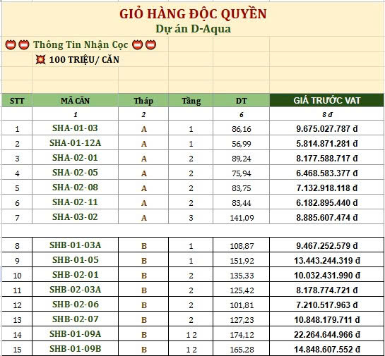 Tại khu căn hộ D-AQUA , chủ đầu tư chỉ thiết kế 34 căn shophouse khối đế . Quý anh chị muốn sở hữu shophouse khối đế này có thể xem bảng giá bên dưới và đặt cọc ngay .
